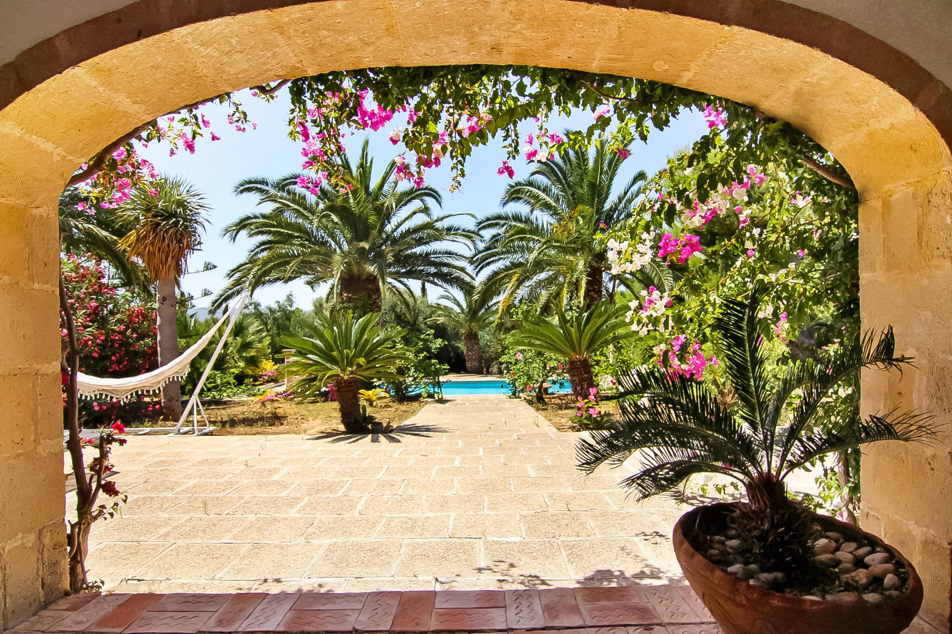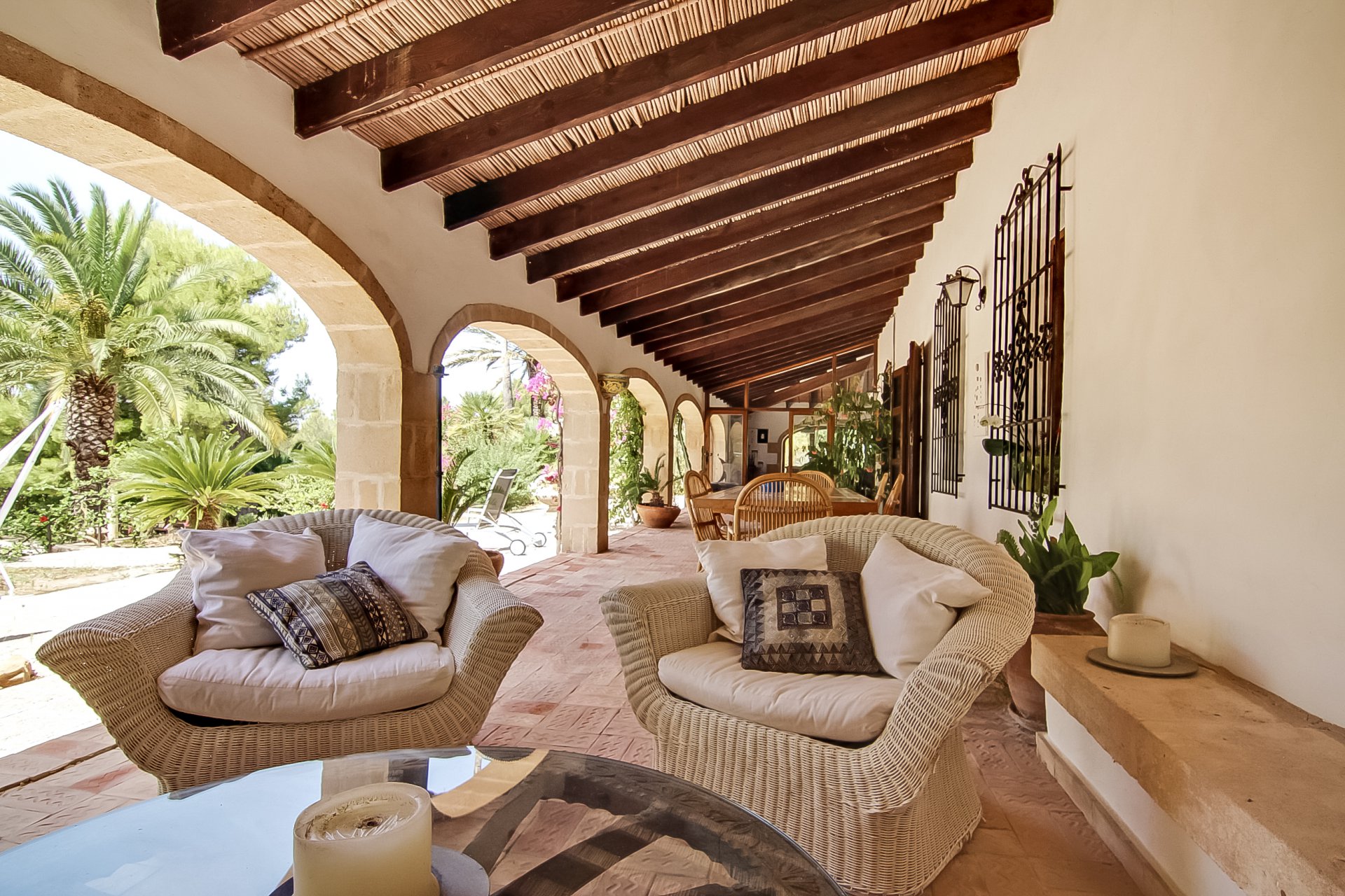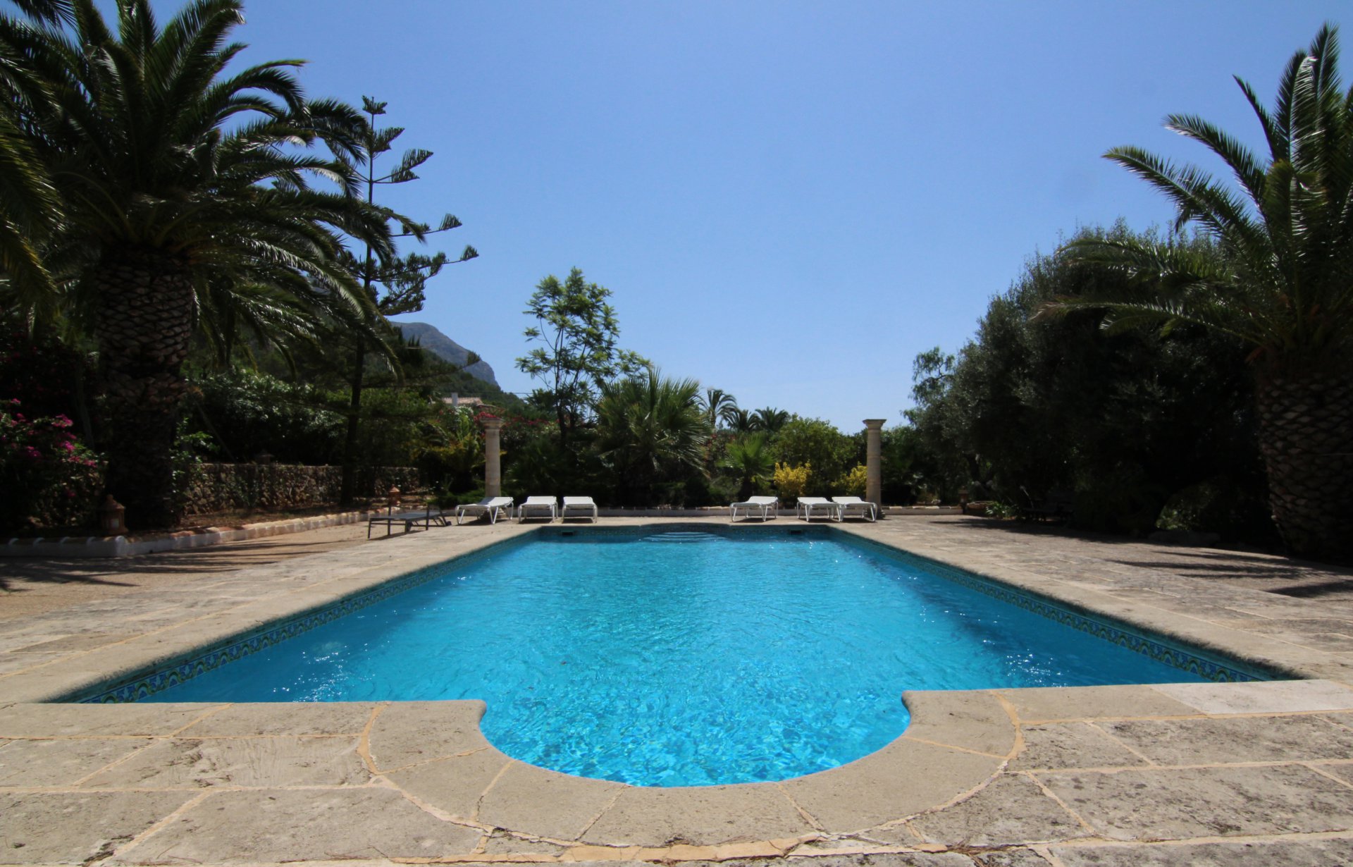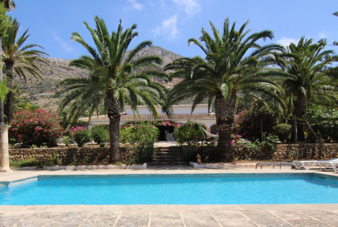 Unique finca with original features, sitting on a plot of 20000 m2. Arriving at the property there is a covered parking area, an outdoor kitchen and terraces. The terrace overlooks the park and leads onto the swimming pool. The living room with a magnificent fireplace, has access to the two spacious bedrooms with plenty of storage and ensuite bathrooms. On the other side, the equipped kitchen, spacious with an adjoining pantry and a patio overlooks the Montgo. The property includes many fruit trees. There is a magnificent second villa for guests. This villa with 3 bedrooms and 3 bathrooms is very well equipped; it also includes a workshop. A unique property designed by an artist of great taste and culture.
