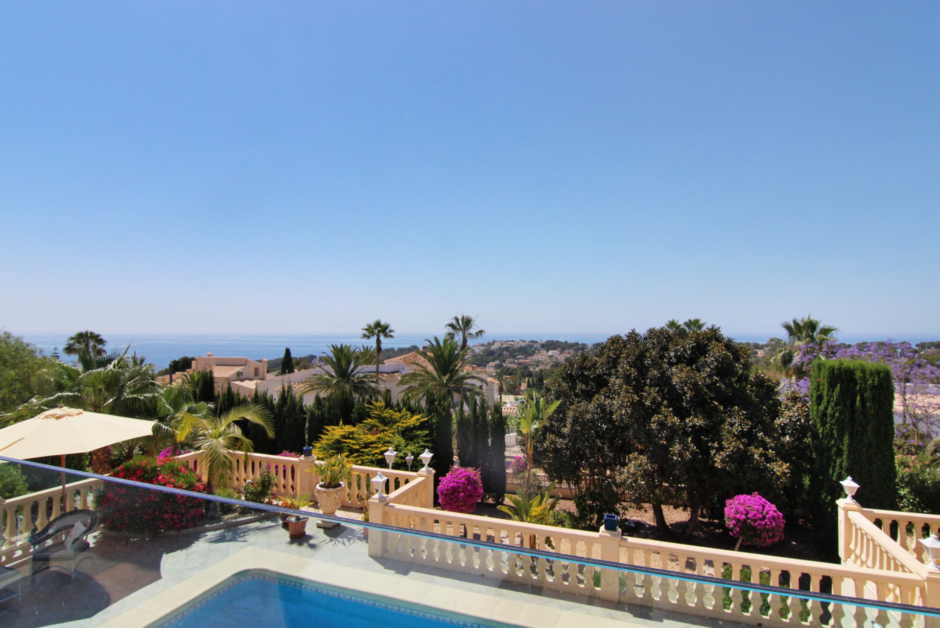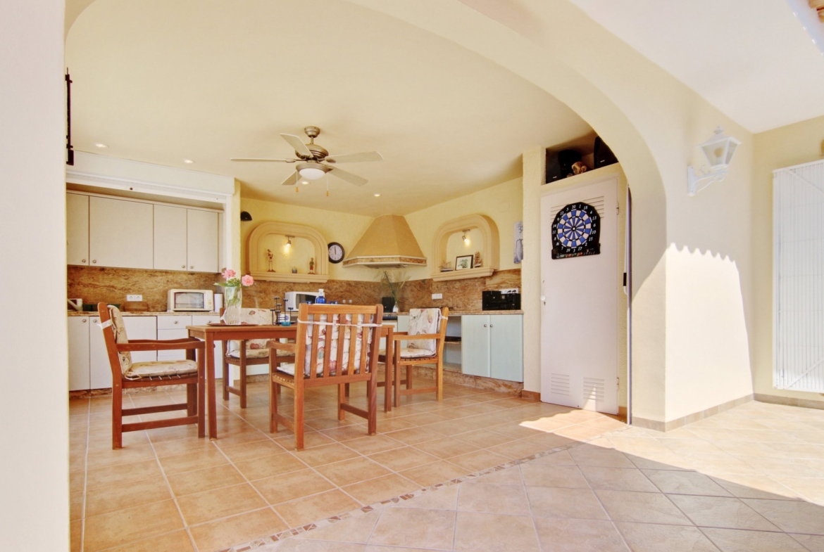 This is a fantastic house in the exclusive San Jaime Urbanisation offering 180 º sea view for Moraira Port to Calpe Rock. In excellent condition you enter into a large hallway and through to a beautiful living area with archways through to 2 dining areas one of which has the perfect sea view with terrace access.On this level there is a large high quality fully fitted kitchen and a large utility room which could easily be converted to another bedroom, guest cloakroom, a Master Bedroom with view down to Moraira Port, lovely dressing area and huge en suite bathroom and a further guest bedroom with en suite bathroom. The outside area of this double plot is outstanding, a large solar heated swimming pool is complemented by a luxurious Naya and high specification Summer Kitchen, there is also a fully equipped bar and a huge storeroom . there is a separate shower room with a sauna and a further bedroom, a double garage and a large carport. Features Include, Intercom, hot and cold aircon , security cameras, alarm, electric gate,solar heating for swimming pool and house hot water and a water purification system,