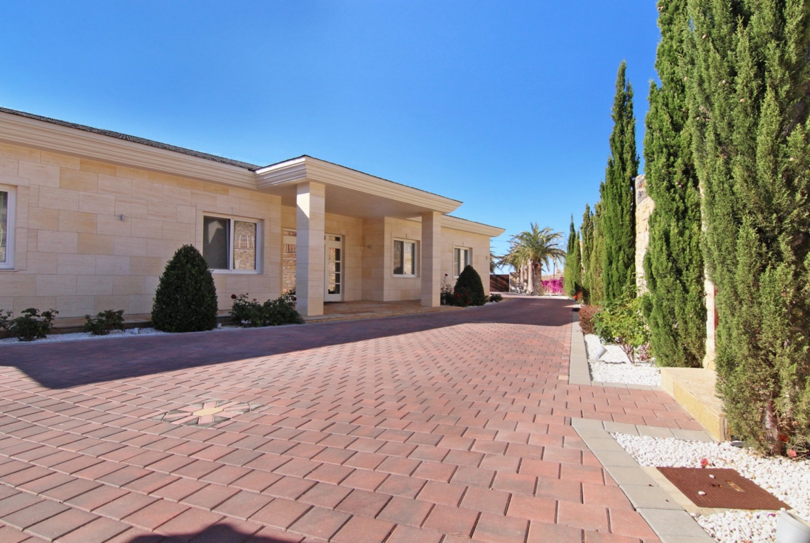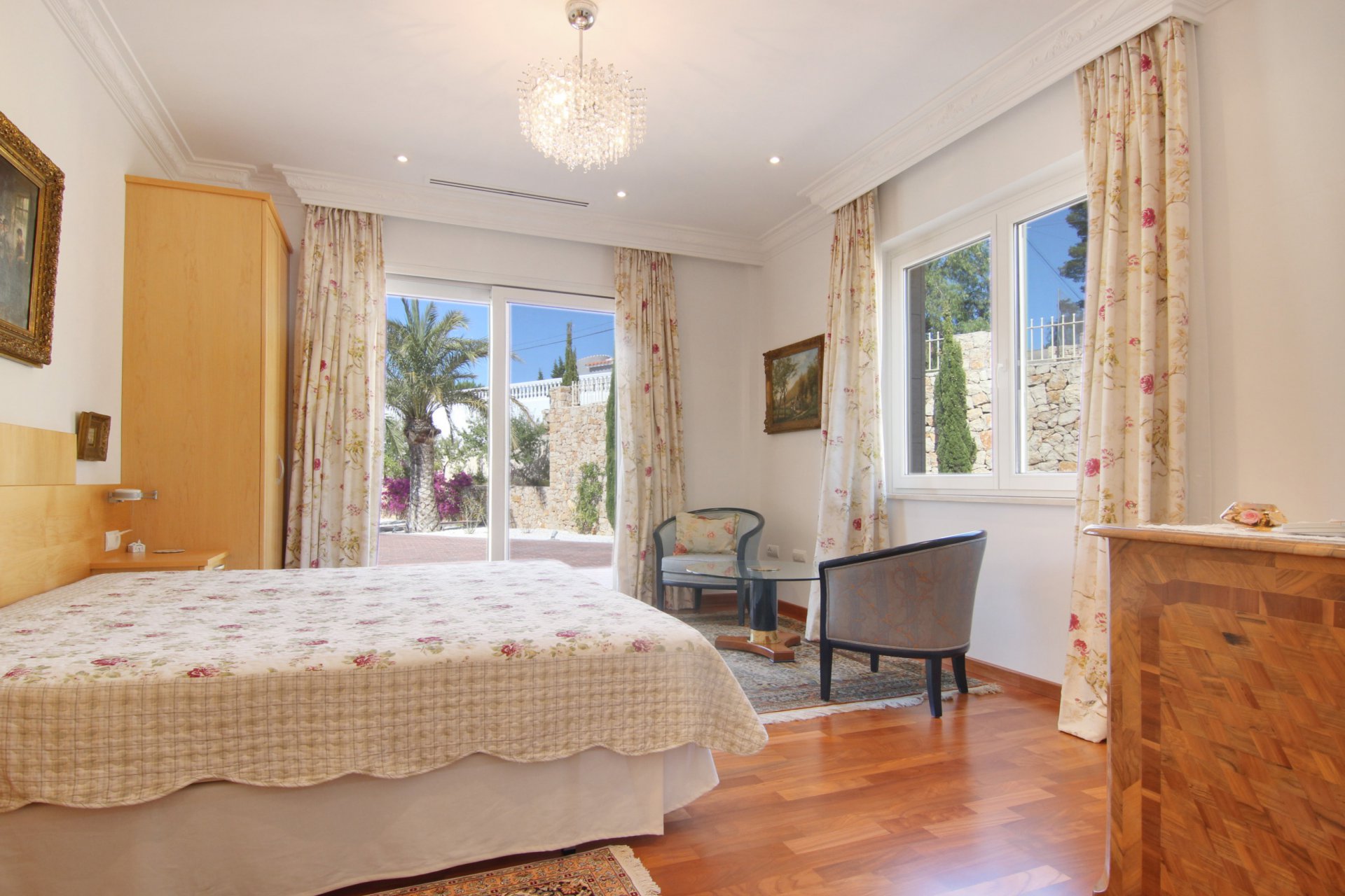Absolutely stunning villa with panoramic sea and mountain views. Upon entering this luxury villa, you are greeted by a natural stone wall, adorned by a rustic, typically Spanish, massive wooden electronic entrance gate. You reach the entrance area and carport via a palm fringed avenue. Having entered through the front door of the house, you stand in the spacious entrance hall that is connected to the bright, light flooded lounge of 100m2, also benefiting from the large window fronts with sweeping views of the mediterranean sea. From there you have access to the generous size terrace that runs along the entire width of the villa and is 6 meters wide. A beautiful closed kitchen/ breakfast room which is fully equipped with luxury appliances and utility area. A further to double bedrooms with en suite bathrooms as well as walk in closets complete the living space on this level. An elevator takes you to the lower level where you are awaited by another enormous lounge with plans to make this into a further 2 bedrooms with en suite bathrooms and sauna room, From here you have access to the indoor swimming pool with shower area ( heated via the solar system ) as well as the adjoining fitness area and large west facing covered terrace with a view of the Montgo mountain. The entire property is surrounded by beautiful terraces mediterranean garden. This property also has another building plot within the grounds.