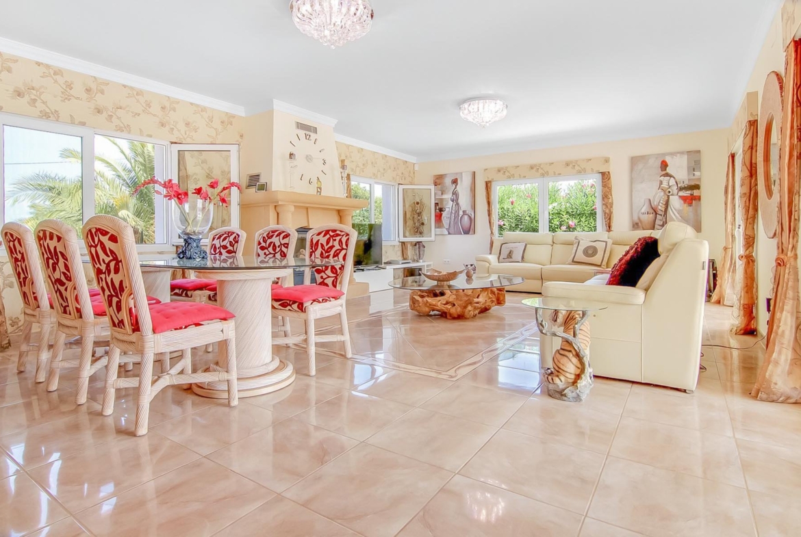 This magnificent villa is situated close to the typical Spanish towns Pedreguer and Beniarbeig. A palm tree lined driveway leads up to the electric gates and gravelled roundabout with a beautiful fountain as the centrepiece. Entering the property you have a beautiful hall that divides the house into two wings. On the left there is an open plan kitchen and a spacious living and dining area, which overlooks the beautiful garden and swimming pool. In the right wing are 2 large double bedrooms with en-suite bathrooms and dressing rooms. The first level features 3 more bedrooms and 2 bathrooms. Two of the bedrooms lead out to a beautiful sun terrace that overlooks the Orba Valley and the Montgo Mountain. On the ground floor, sliding doors lead out to the front of the villa with a delightful shaded Naya overlooking the swimming pool area and wooden gazebo. This property must be seen in order to fully appreciate it. If you are looking for tranquillity without being too remote, this could be your dream home. Other features include: under floor heating, A/C units throughout, solar panels, wood pellet burner, UV filtered swimming pool, orange groves, pond with Koi carp, traditional log burner.