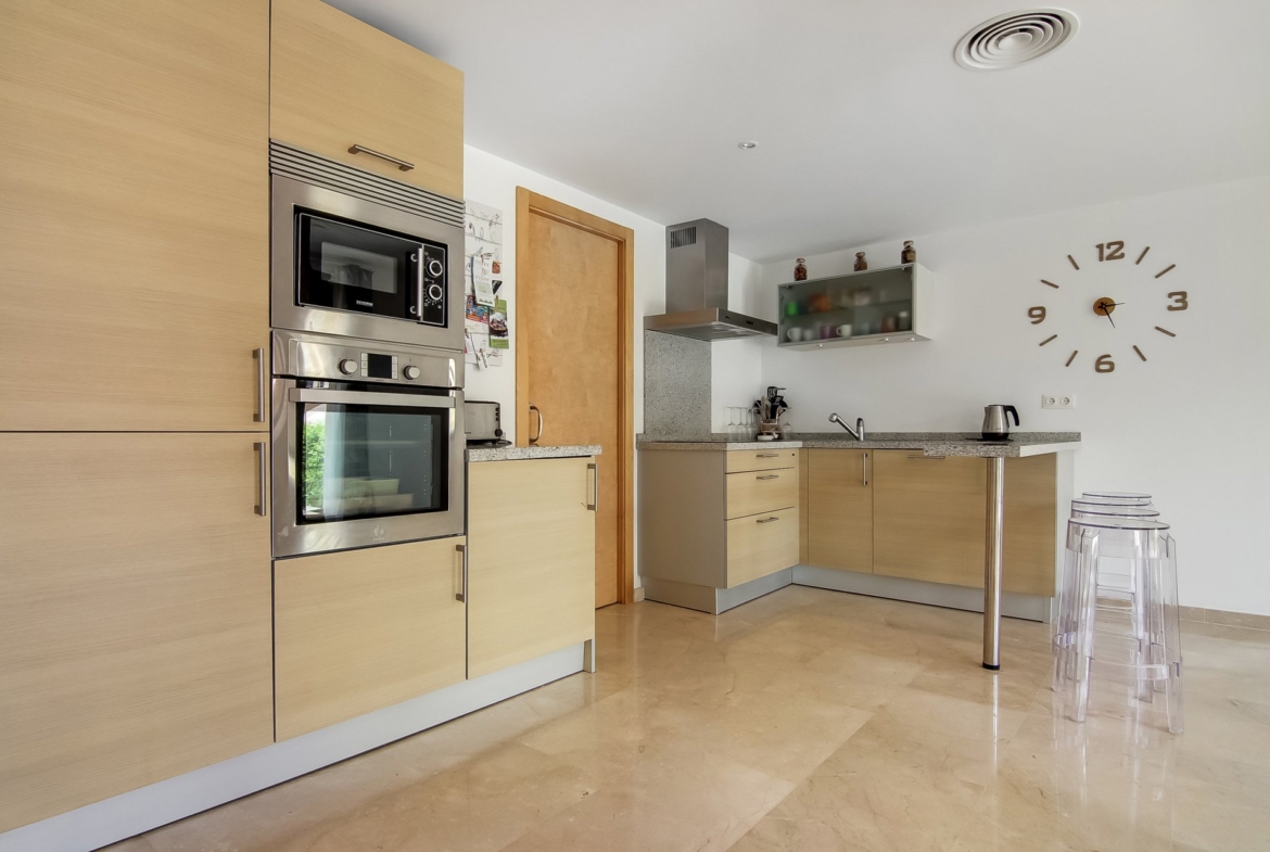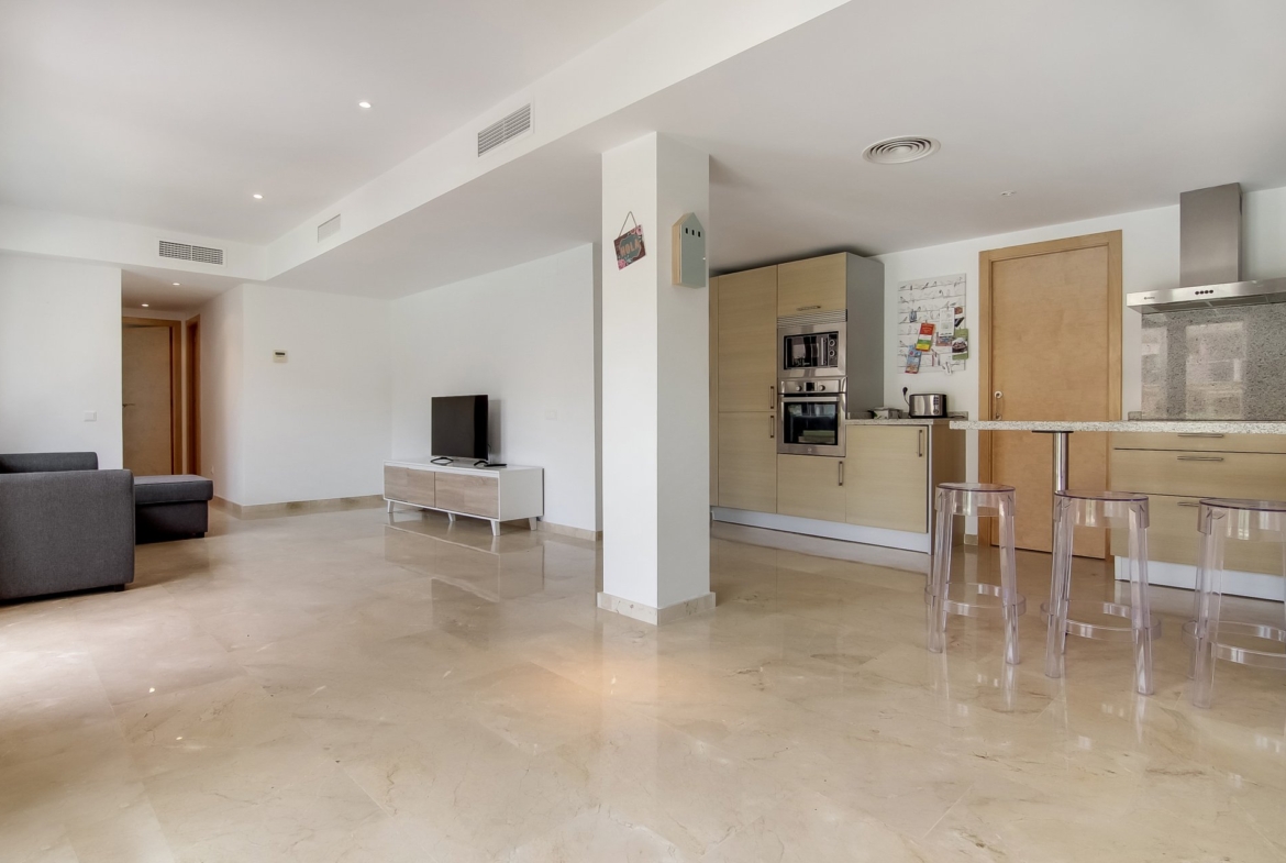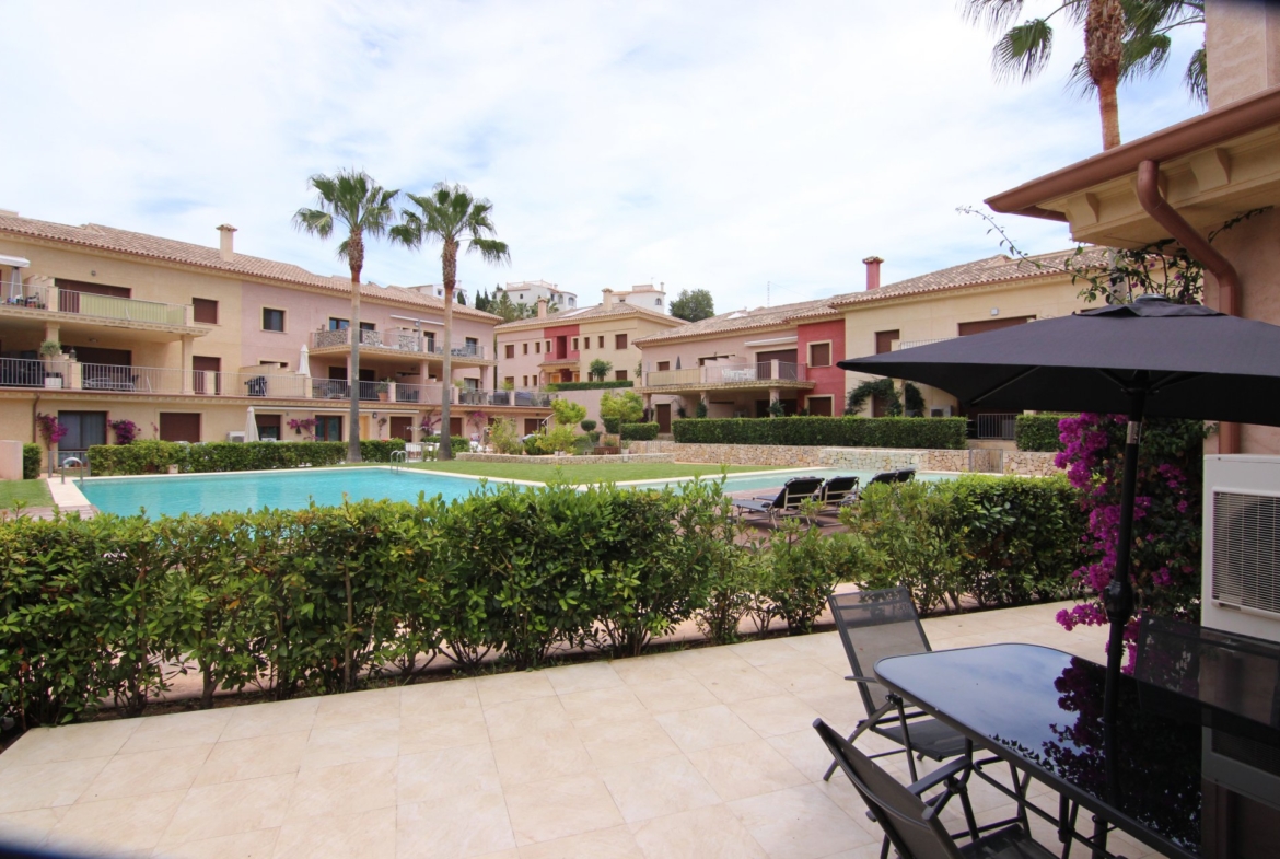 This fabulous ground floor apartment is situated in one of the best complexes in a residential area of Montemar, very close to the breathtaking beaches like “Cala Baladrar” and “Cala Advocat”, and only a few minutes away from the town of Moraira. The apartment itself has an open plan modern kitchen, a good-sized living room, 2 bedrooms and 2 bathrooms, and a large terraced garden at the front, which leads out to the communal swimming pool. In the master bedroom you have an en-suite bathroom and dressing room. A parking space and storage room are also included. The complex benefits from 2 outside swimming pools, an indoor pool and Spa facilities.
