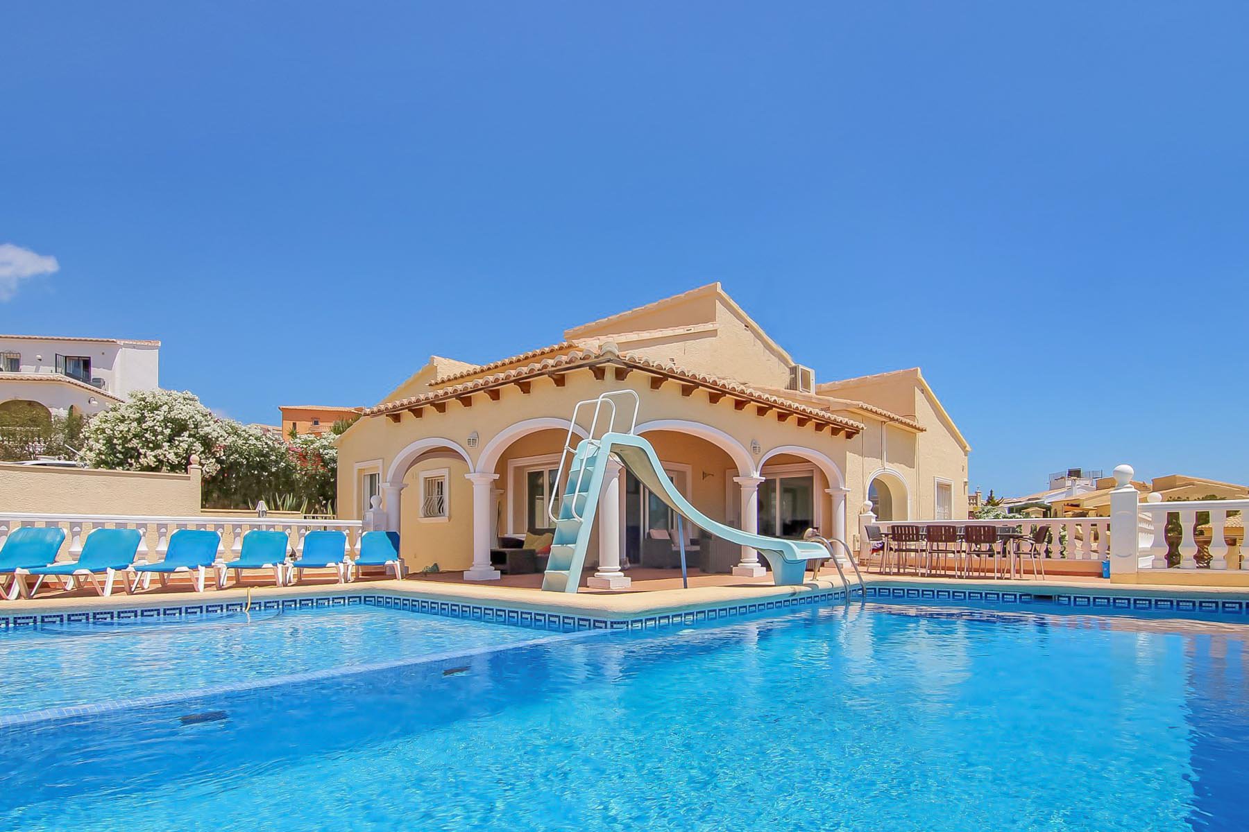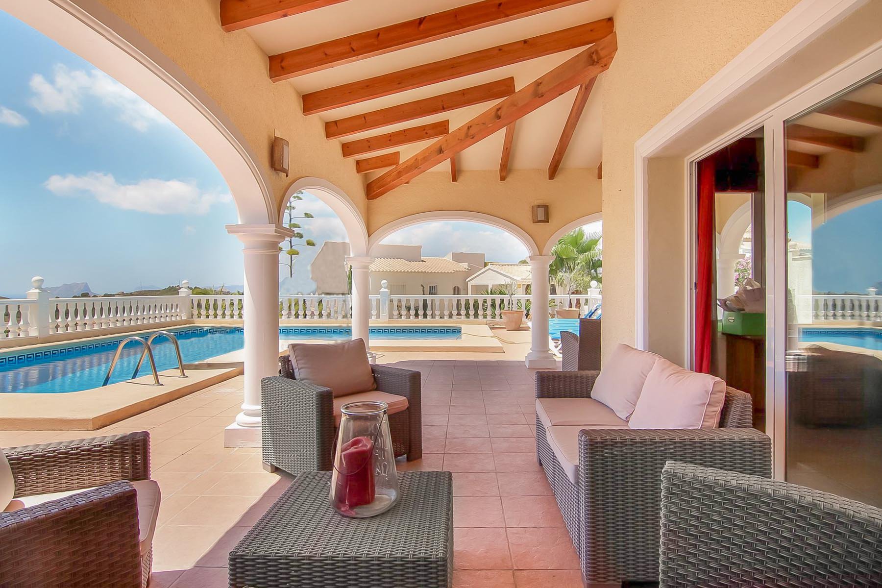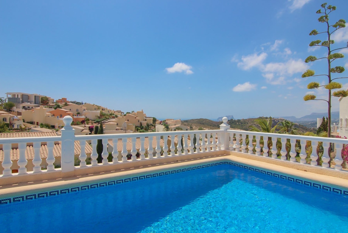 This beautiful villa is situated in “Cumbre del Sol”, which is known for spectacular open views. Nearby the beautiful beach of “Cala Moraig”, nice restaurants and a supermarket that is open 7/7. The villa disposes of a large living/dining room with a modern kitchen, with acces to the Naya, which offers a beautiful view of the Calpe rock «Penon d’Ifach». On this level there are also 4 large bedrooms and 3 bathrooms. An internal staircase leads to a separate living room that can be converted into a cinema room or gym. There is also a very large bedroom with an ensuite bathroom with shower and bath. The villa also has a low-maintenance garden, a large swimming pool with paddling area for children, a large terrace and a separate barbecue. Looking for a large family home or a rental investment? This can be it!