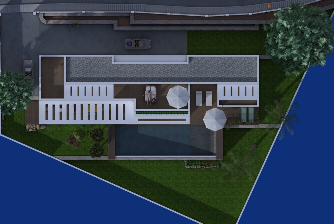 New development. Beautiful modern villa with straight lines at a short distance from the beach and the center of Moraira. Villa of 239 m2 on two floors, build on a large plot of 836 m2. The ground floor consists of an entrance hall, large living / dining room with access to the beautiful, partially covered terrace with pergola and swimming pool, separate kitchen with breakfast bar and also access to the terrace, utility room, guest toilet, 1 large bedroom with fitted wardrobes, en-suite bathroom and a private covered terrace with Jacuzzi. On the top floor there are 2 further bedrooms, both with a private covered terrace, bathroom and big solarium offering beautiful views. Beautiful garden, large pool, carport, south facing, sea views. This is a new project and it is possible to choose the materials and / or changes in lay-out.
