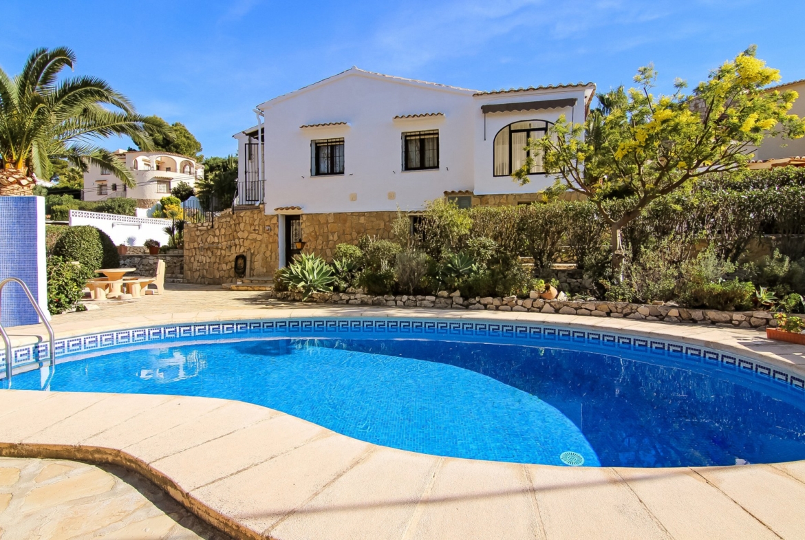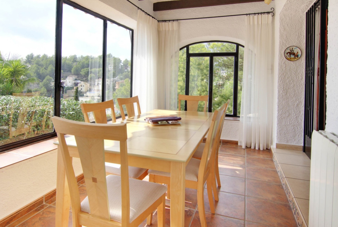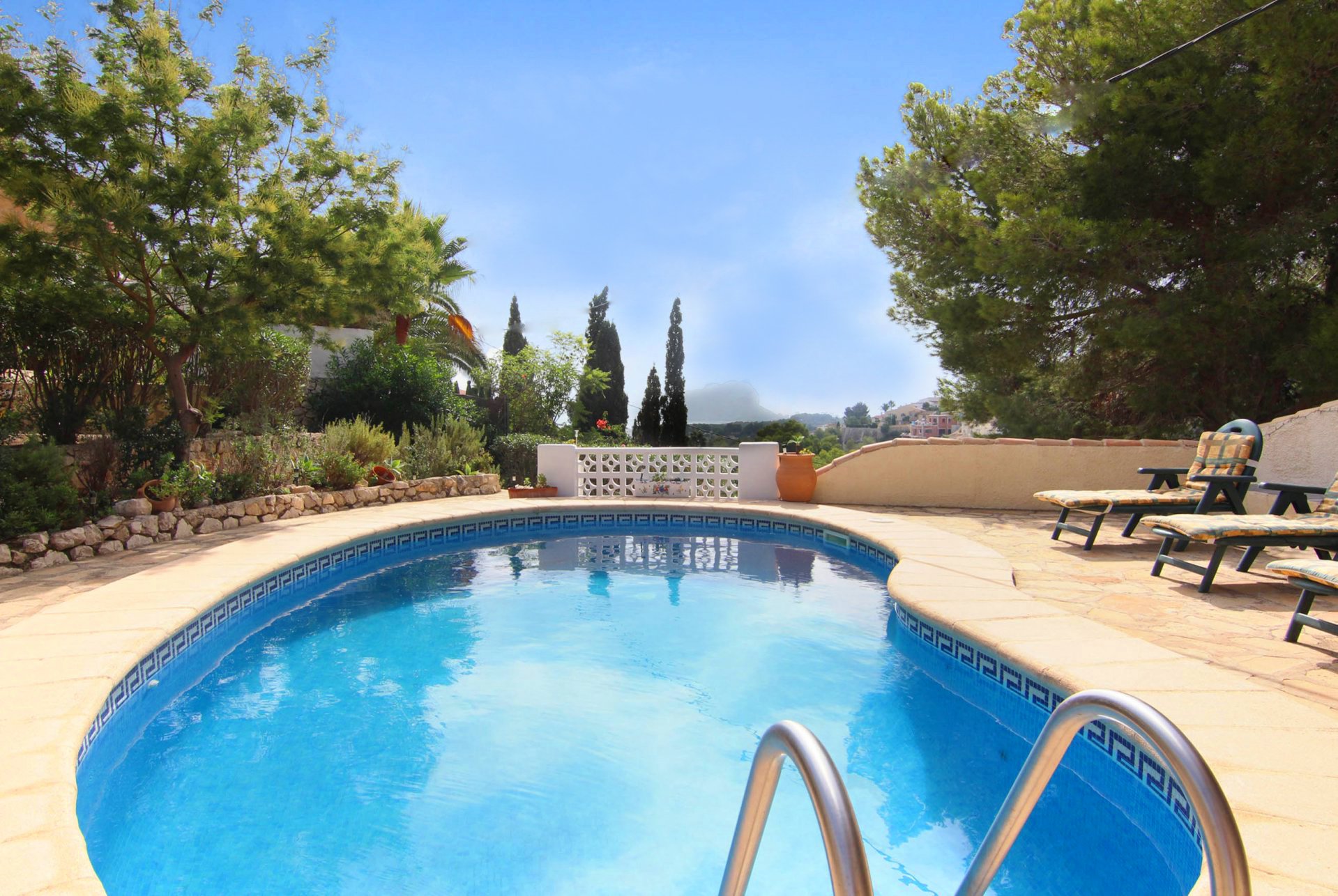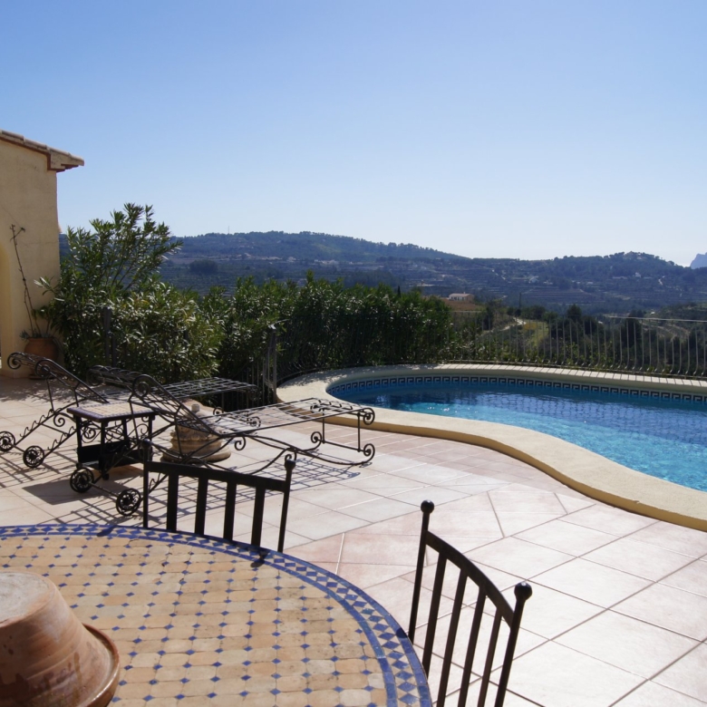 Nice villa in Benissa Montemar, on the main level the villa consist of 2 bedrooms, 1 bathroom, kitchen, a lounge with open fireplace, dining room with a nice view, and a second lounge that could easily be converted into a 3th bedroom. Below is a separate studio apartment, a store room, pool and covered BBQ area. From the pool and the BBQ area you have sea views and a great view of the Calpe rock de Penon de Ifach. The villa is in very good condition and has central heating and air-conditioning.