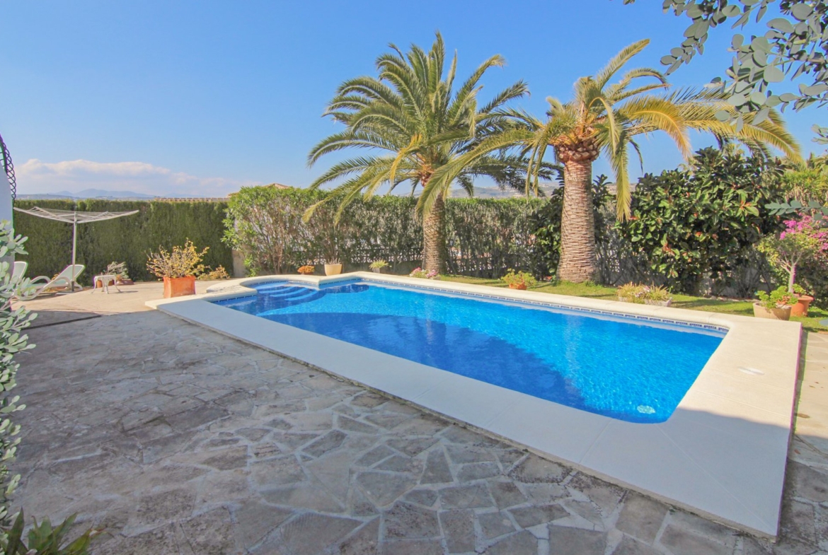 This fully detached villa occupies a generous sized, level plot and enjoys panoramic views across the Moraira Valley. Located approx. 3km from Moraira centre and within 1km of supermarket, restaurant and bar. The accommodation on the main level includes two bedrooms, two bathrooms, a good-sized lounge, enclosed Naya and kitchen. Within the under-build is a self-contained apartment with bedroom space, seating area, kitchenette and shower room. There is further under-build space providing storage and workshop areas that could be converted to further bedroom/living space. The 8x4m pool is totally private and there is parking for 3/4 cars including a carport. The house is double glazed and has gas central heating throughout (including the under-build).