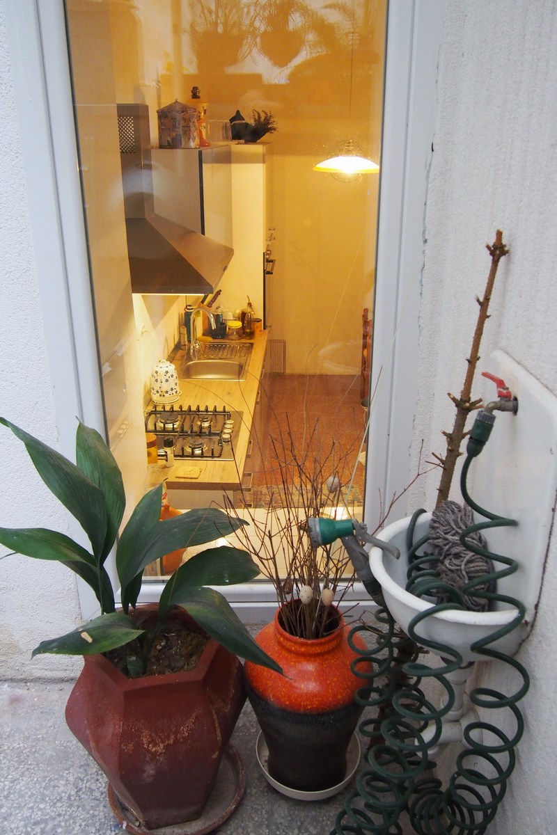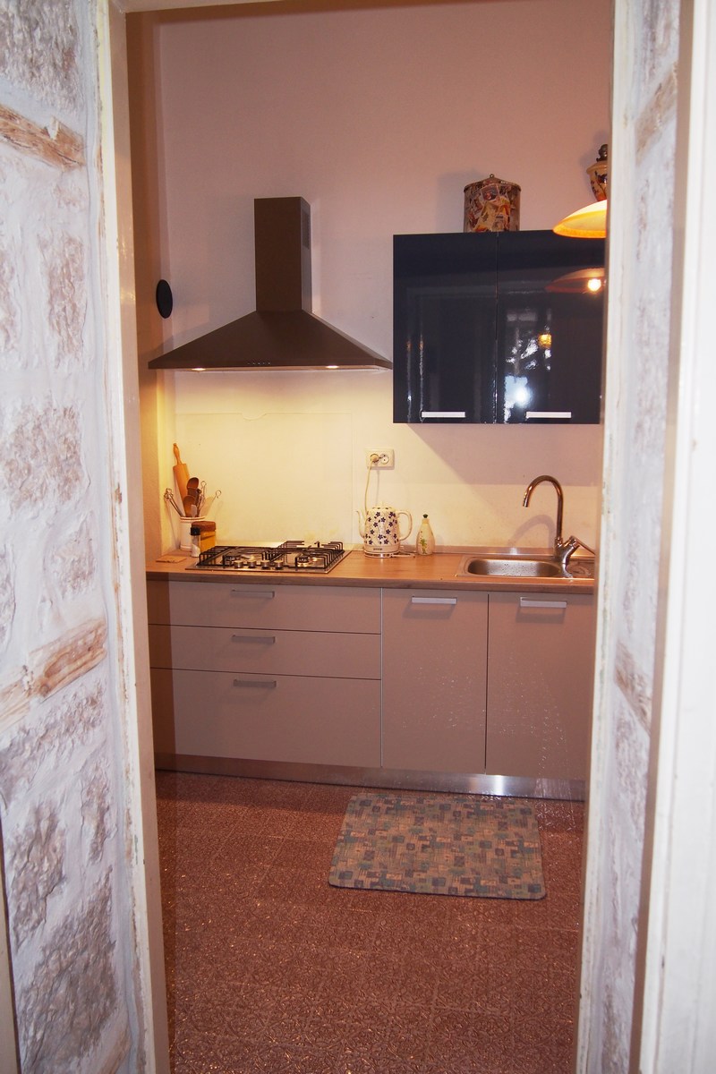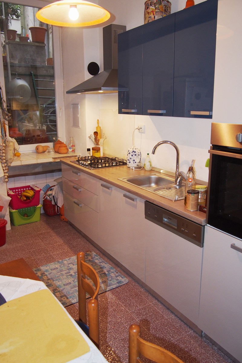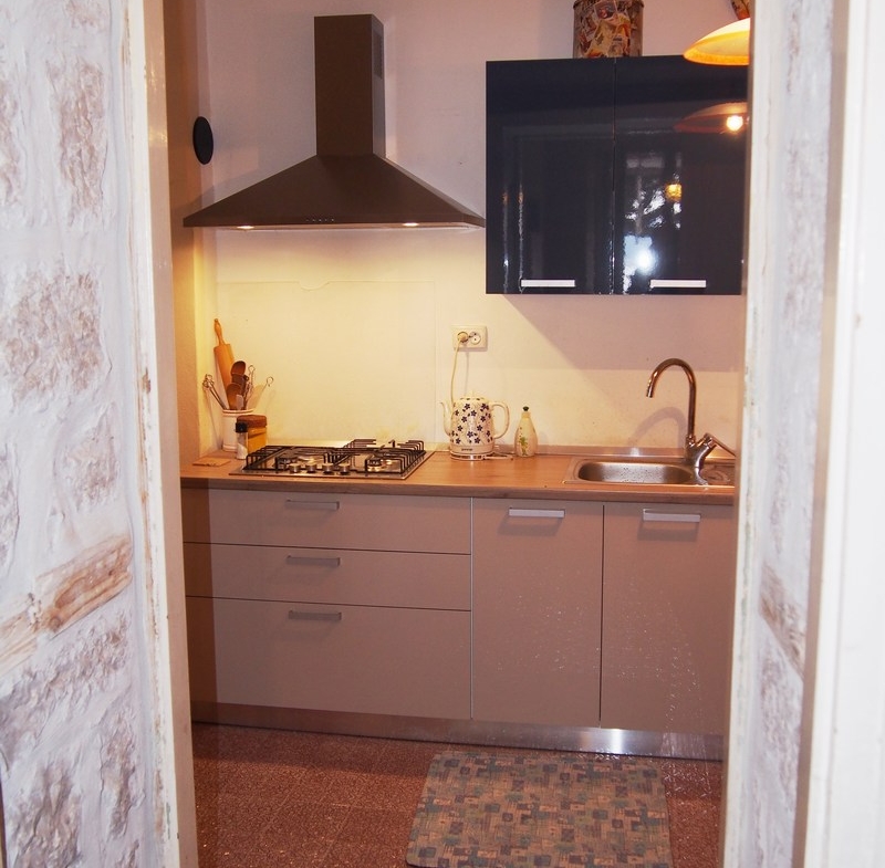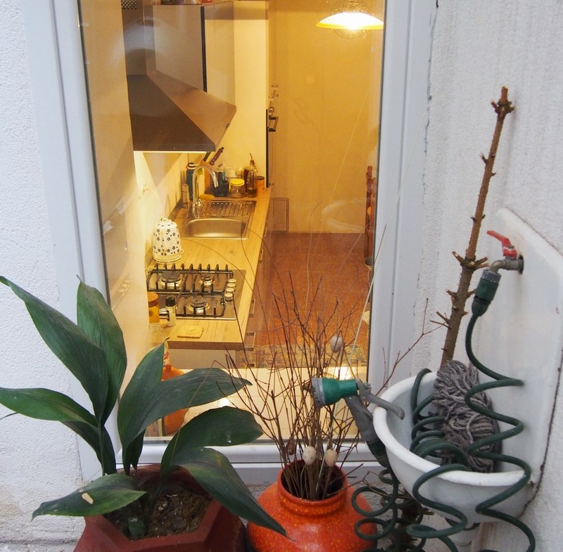 Desno se nalazi kuhinja koja ima izlaz na terasu u atriju zgrade, kupatilo i odvojeni toalet.
