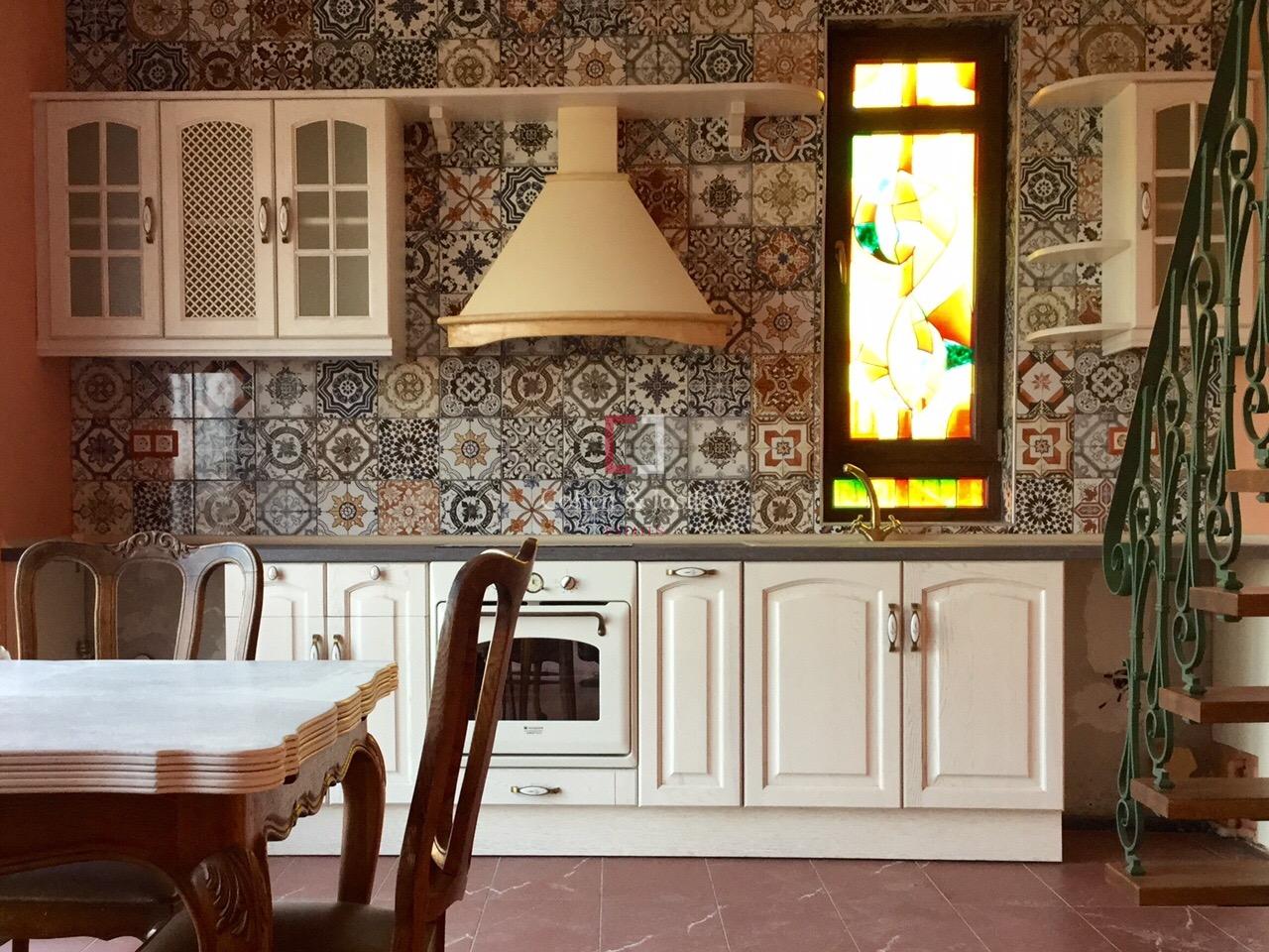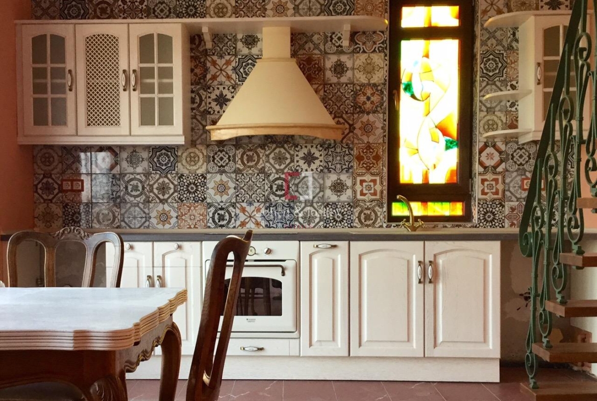 The house is finished with natural stone and is sold with partial furniture, which includes a kitchen with electrical equipment and dining furniture.