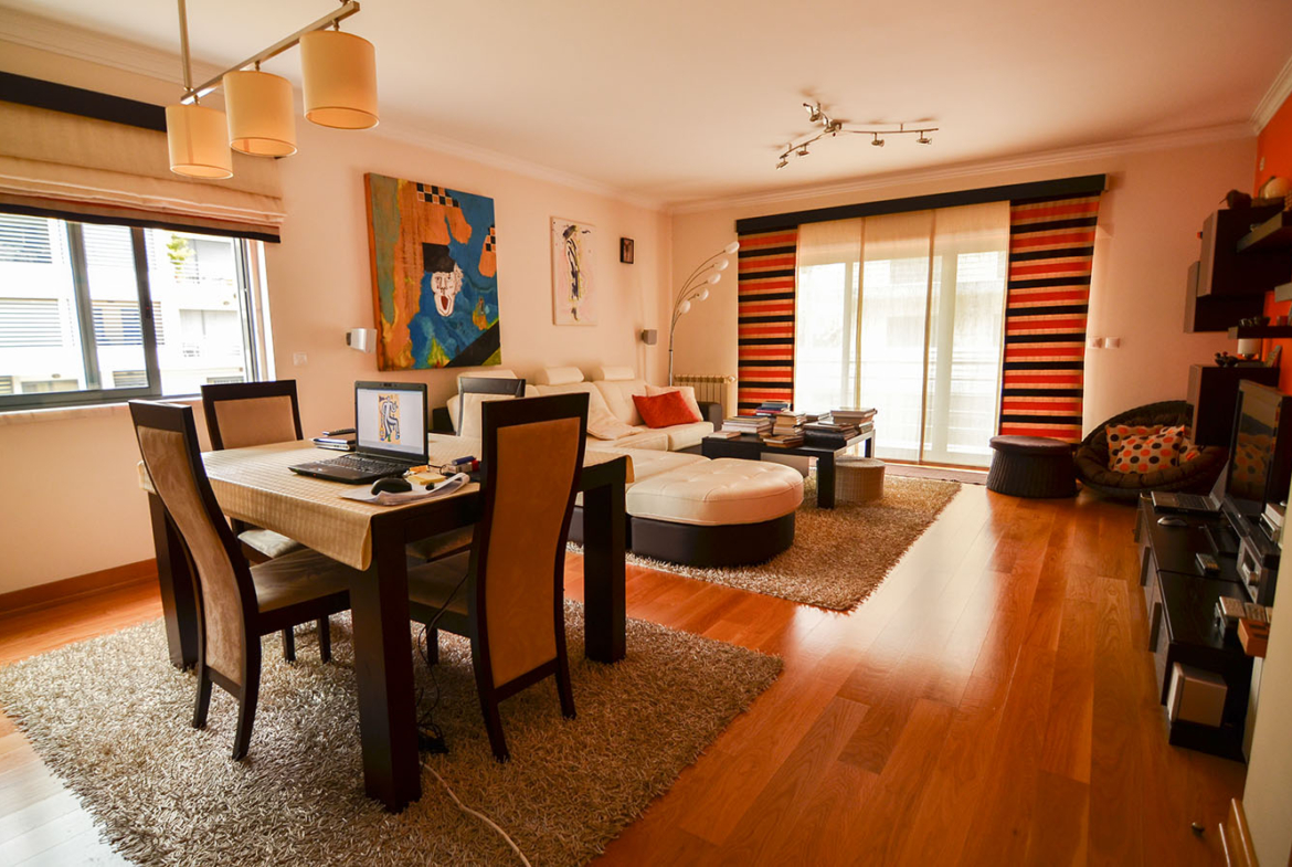 Remarkably spacious 2-bedroom apartment in top condition, within walking distance of Cascais villa, having two wide balconies of roughly 17m2 each, west-east orientation, both facing towards public gardens.