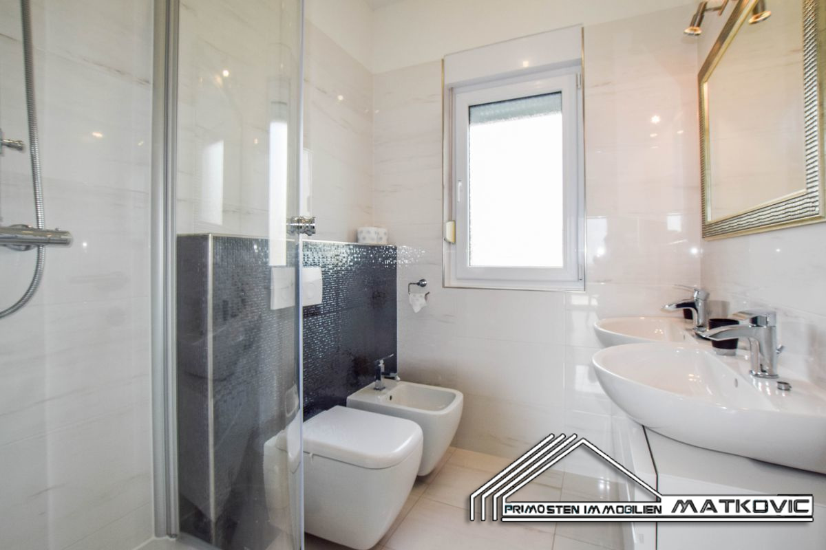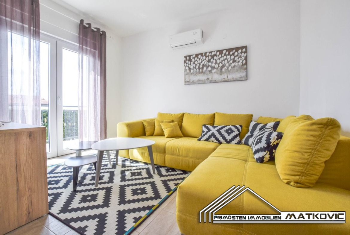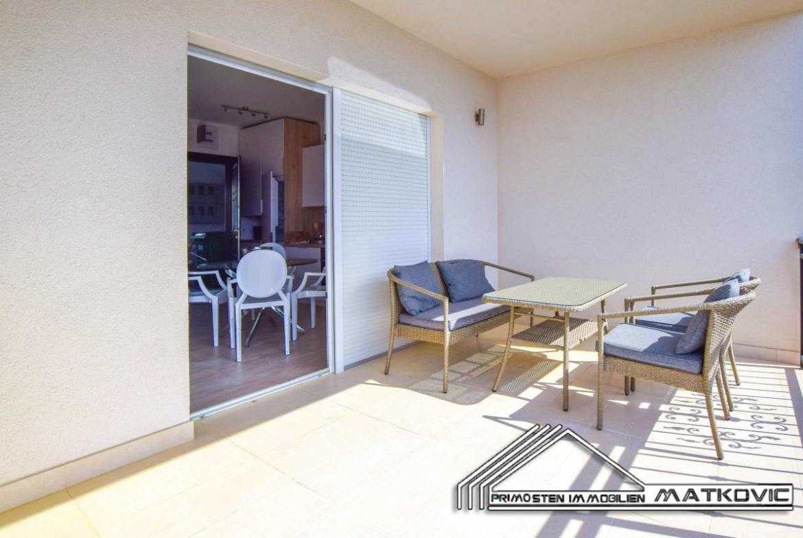 Newly built luxury apartment located on the ground floor of a residential building, and it has a total living area of 59 m². It consists of a living room with kitchen wich leads to the balcony, bedroom and a bathroom. The apartment has a parking space, a garden located in front of the building and a common pool of ca. 24 m². The apartment is fully furnished and air-conditioned. Distance from town center and beach is ca. 600m.