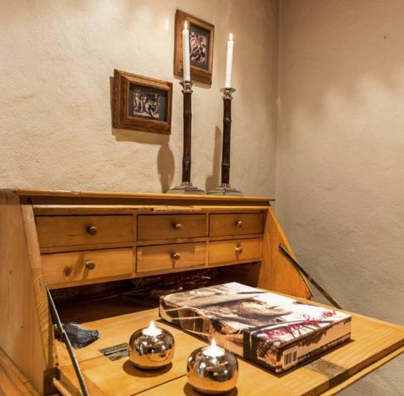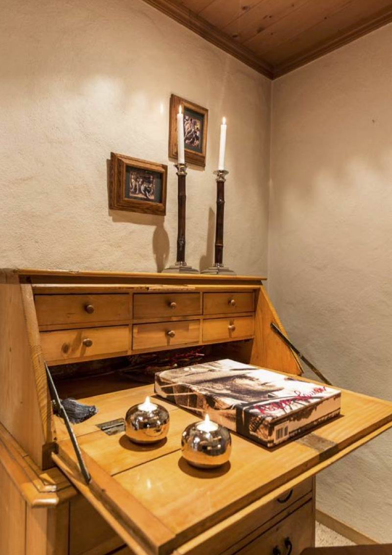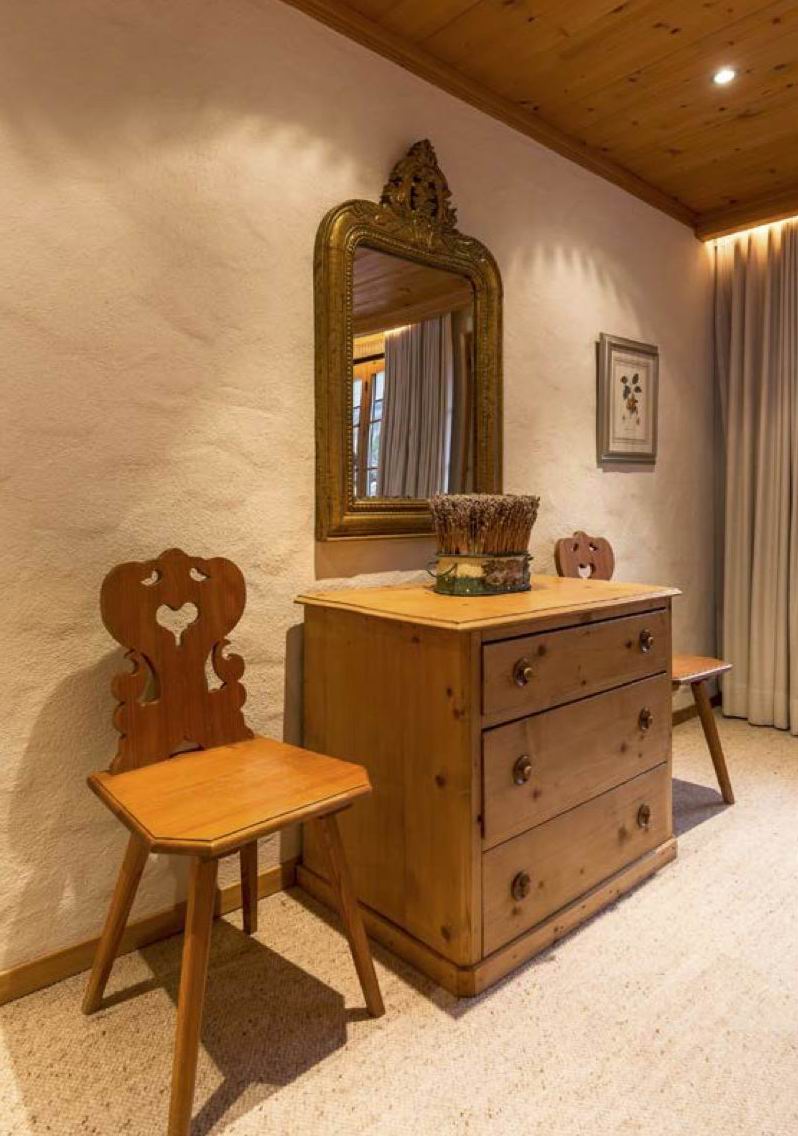 The apartment is located on one of the main streets of Gstaad and has a view of the surrounding mountains.