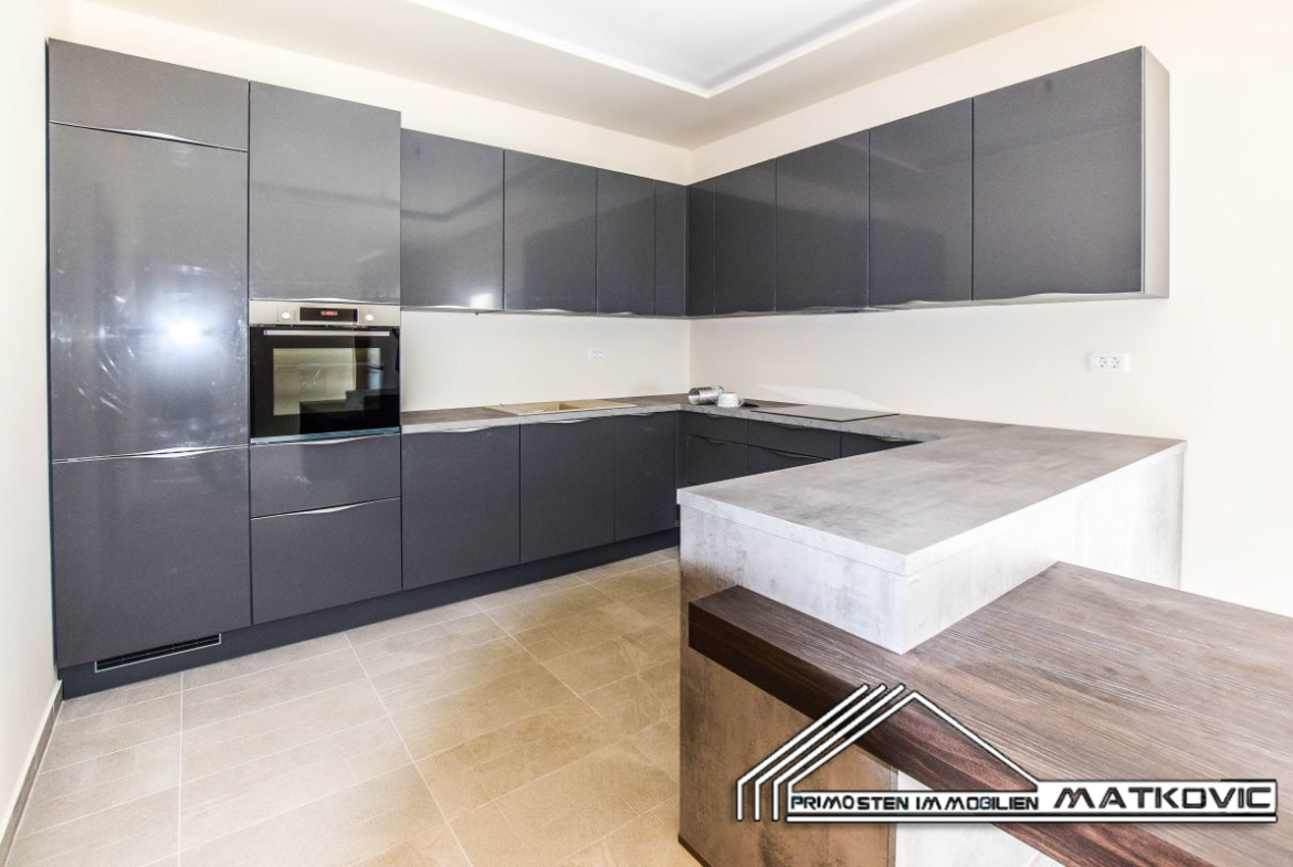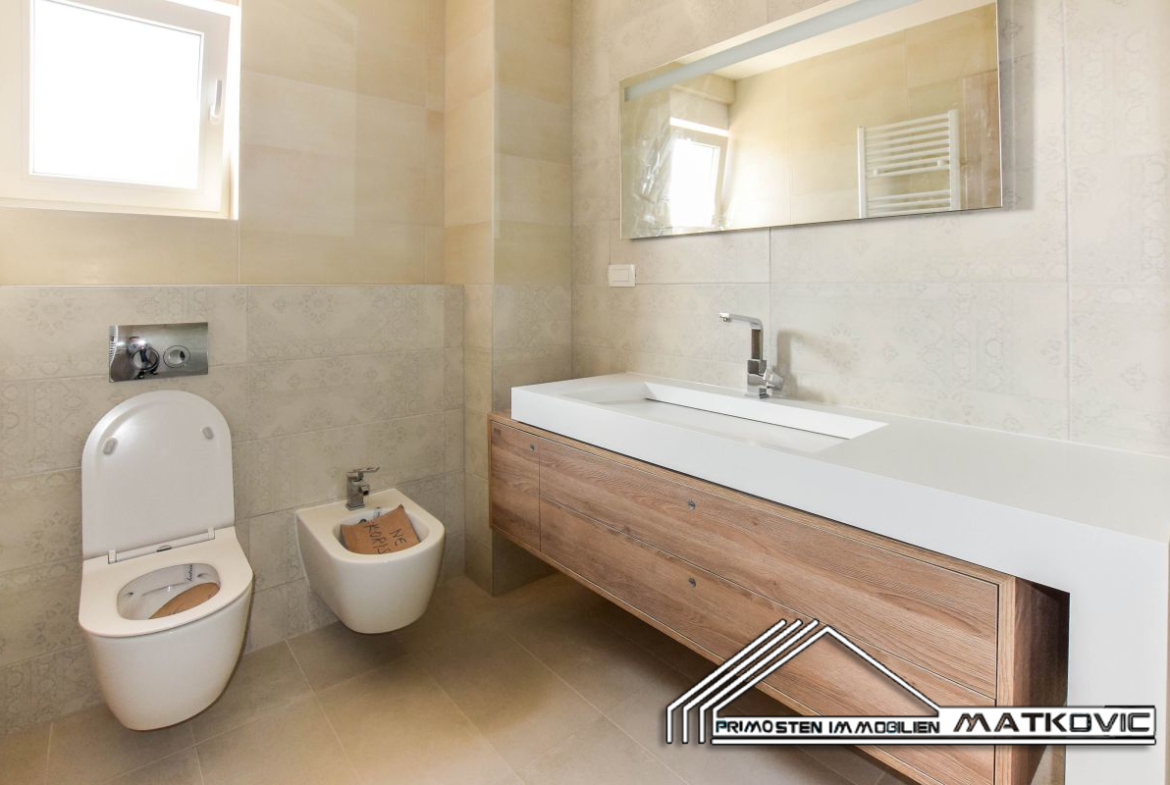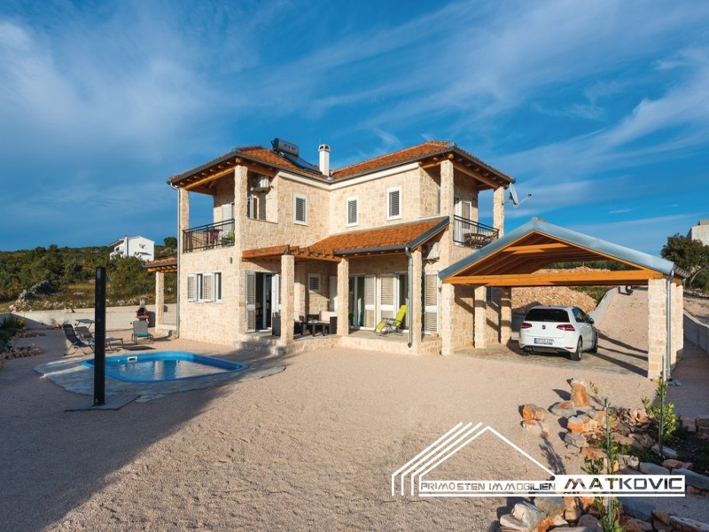 The modern villa with Mediterranean flair in Primosten, has a usable area of 290 m² and covers a plot area of 650 m². It is in a prime location, with unobstructed sea views, which is unparalleled. Each floor has a terrace with fantastic and unobstructed views of the open sea, the surrounding islands and even the historic village of Primosten. The neighboring houses are also modern new buildings and thus results in a homogeneous overall picture in the immediate vicinity. The premises of this high quality and comfortable villa with three floors are connected by an inte rnal staircase, built to Western European standard and are divided as follows;
