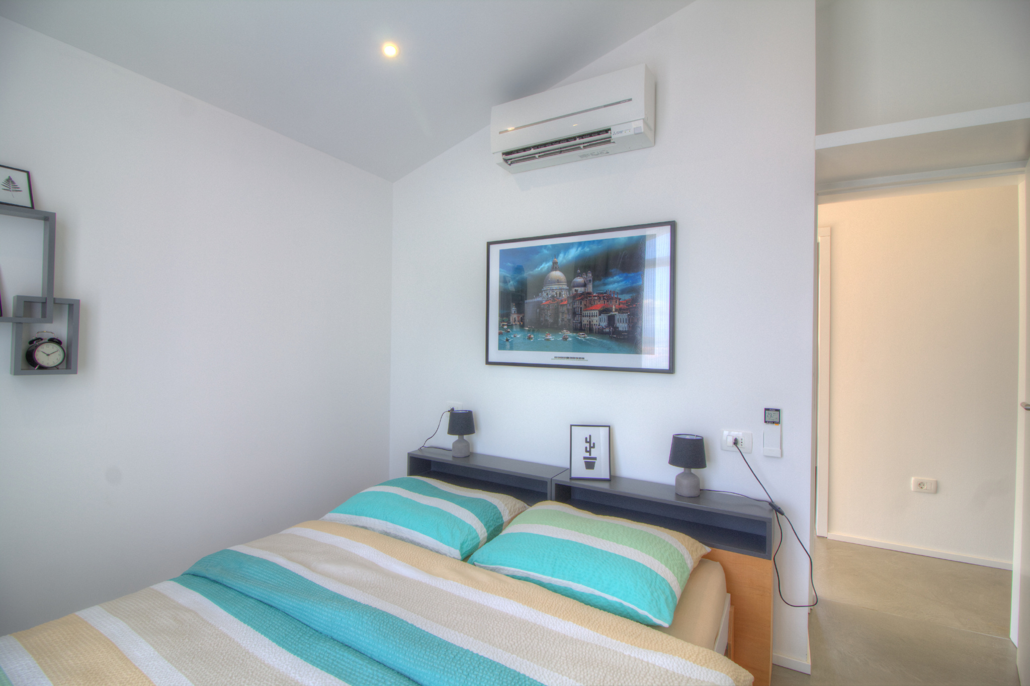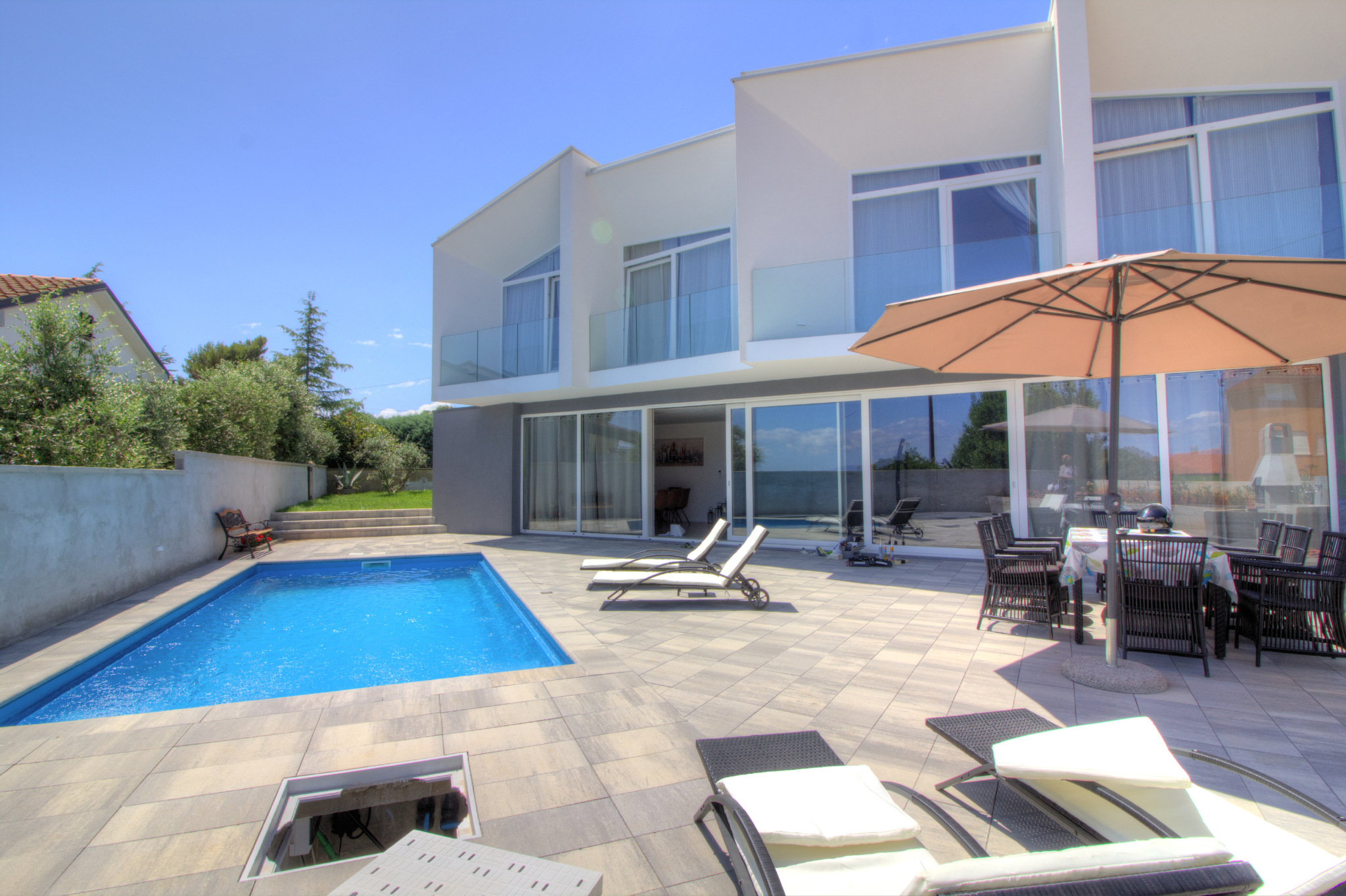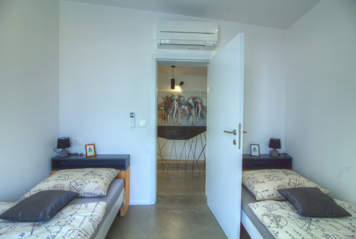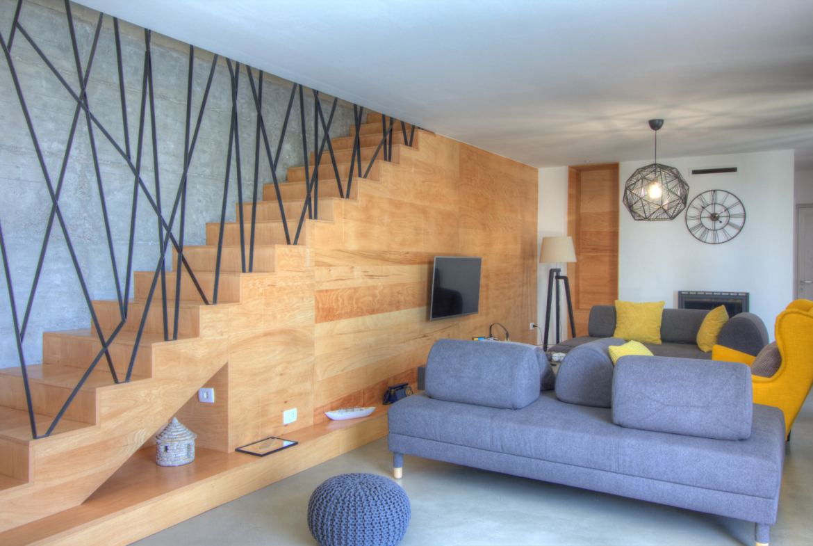 This newly-built modern and stylish villa offers approximately 140 m2 of useful space spreading over the ground and the upper floor. On the ground floor there is an extra-spacious living room with kitchen and dining area, separate toilet, laundry and two storage areas. From the living room a direct access is provided to a spacious outside terrace, a sunbathing area and a swimming pool (compass 8 x 4 m) with outdoor shower, and a lawn with a BBQ. On the upper floor there are four stylish bedrooms and two bathrooms. The plot is approx. 508 m2. Air-conditioned (5 units), fireplace in the living room, parking, high quality thermal insulation. Great location.