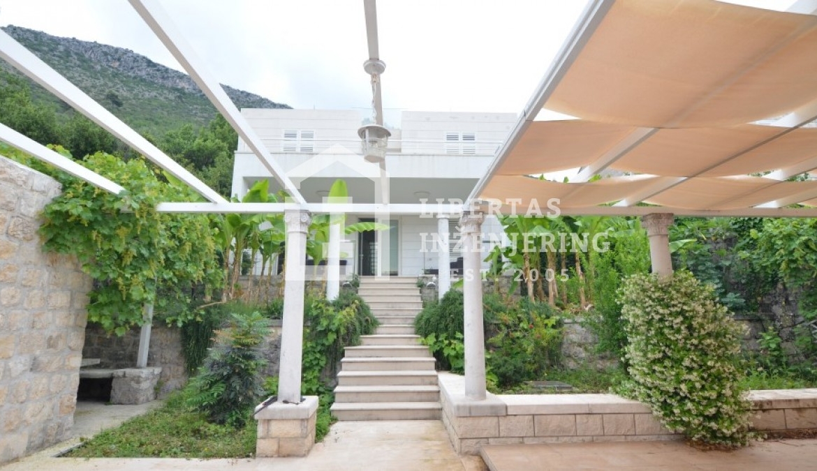 Smaller modern villa with swimming pool, second row from the sea, in close proximity to Dubrovnik… All characteristics that draw attention to this property. Main house has 128m2 of living space that spreads out over two floors. On the ground floor there are a spacious living room, dinning room, kitchen and a guest bathroom. All opens up to the front terrace. First floor consists of four bedrooms each with its own bathroom, and second smaller terrace. Very sunny and bright. In the back garden, in apsolute privacy there is an enclosed swimming pool. In front of the villa in the courtyard several uncovered parking spaces, and an extra small apartment in garden house. Everything stated makes this property / WORTH SEEING