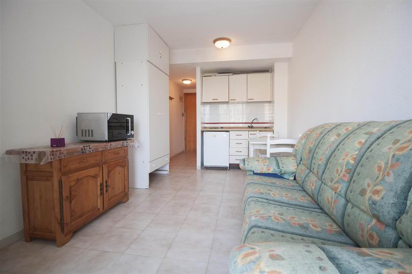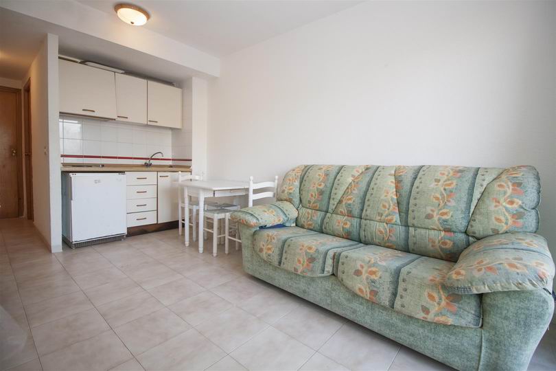 4th floor. The total area is 32 sq.m. Living-dining room, American kitchen. Terrace – 6 sq.m. Cozy, furnished apartment, with installed household appliances, kitchen furniture. The windows face west. The apartment is in good condition. The house has an elevator. Communal swimming pool.