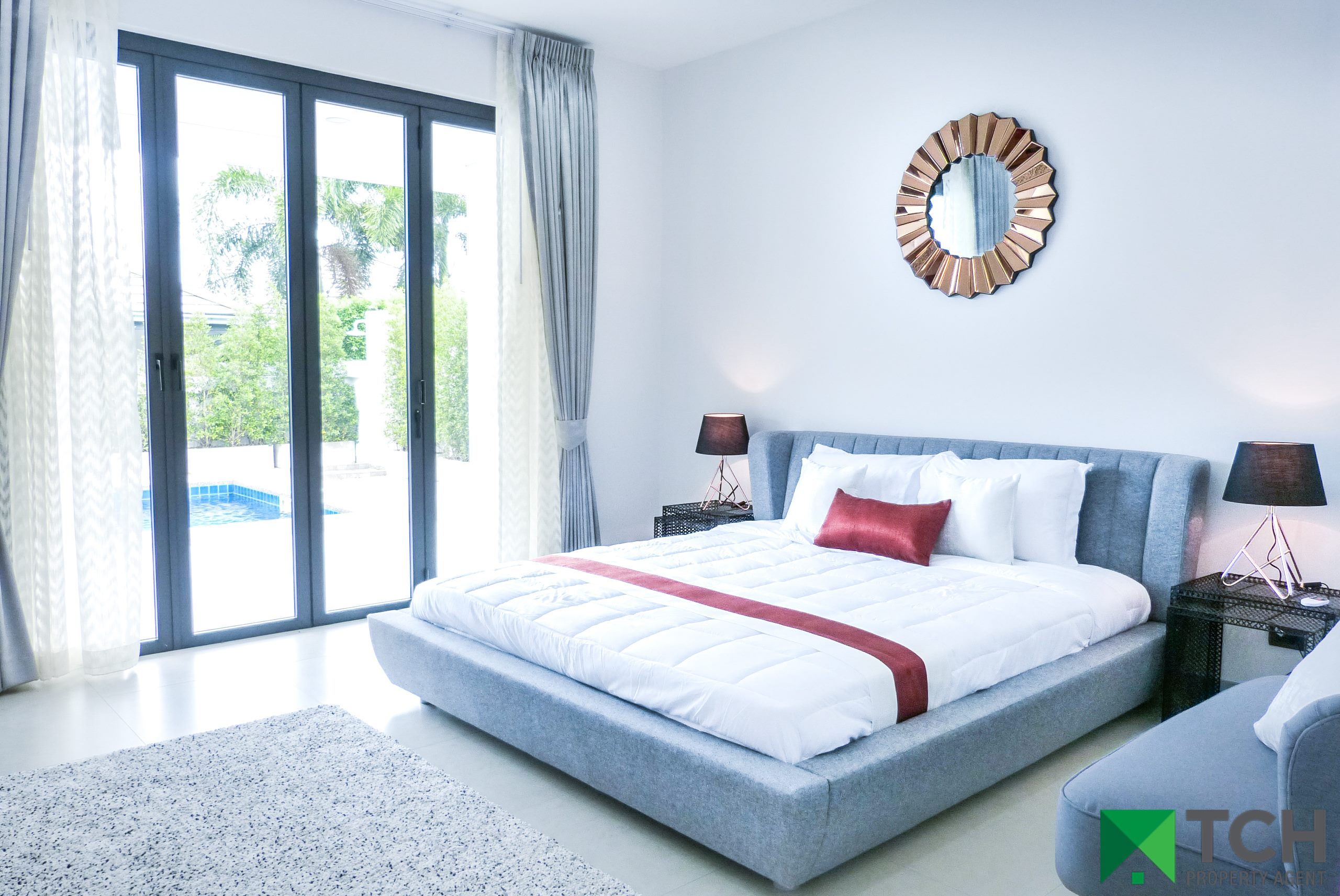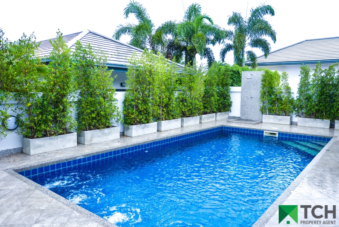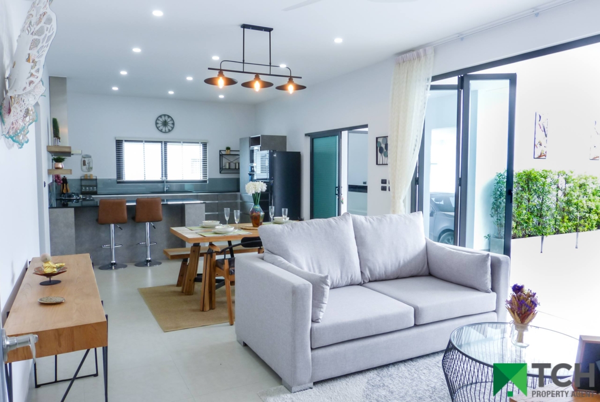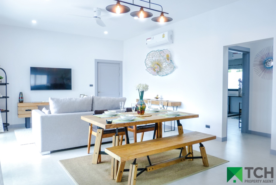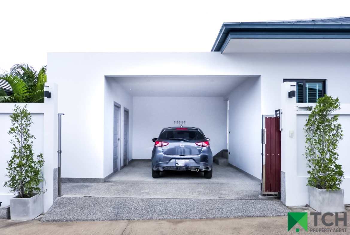 On a small development, all villas are already constructed and built to a high specification. Fully furnished to a high standard, these villas have a modern feel and come with a covered car port with store room and a large separate laundry which could easily accommodate a Thai kitchen.