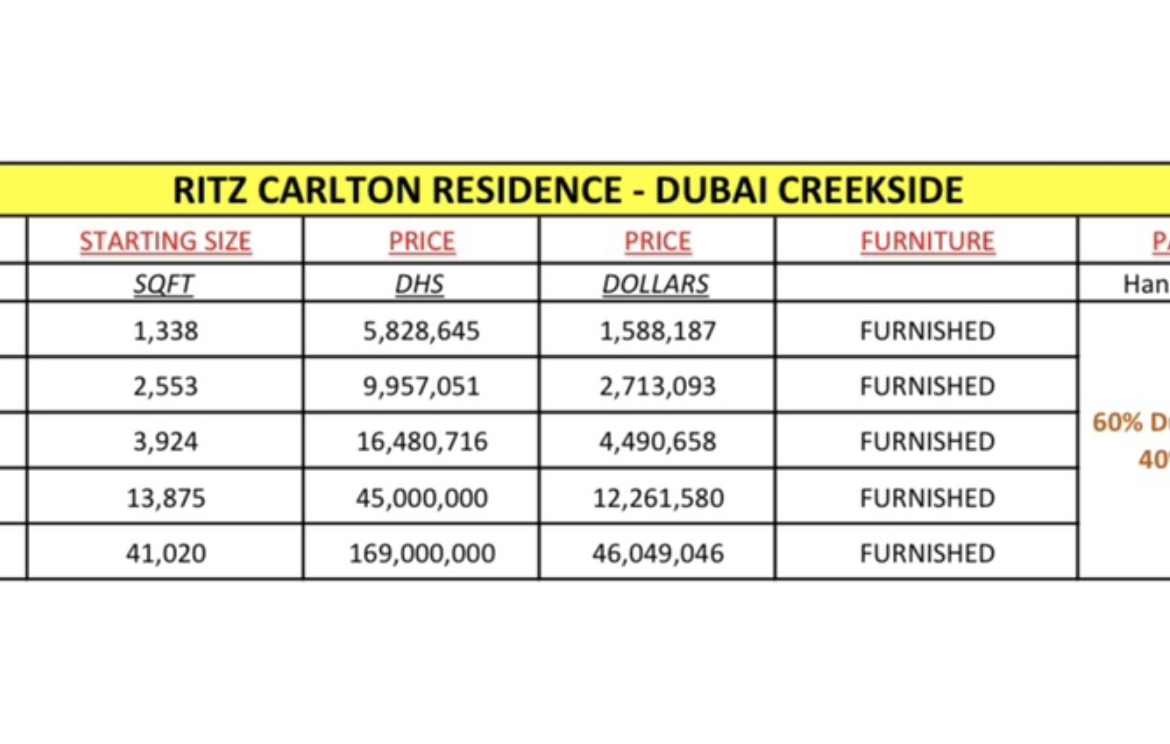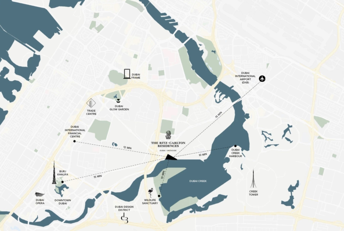 We are presenting to you The Ritz-Carlton Residences with 1BR, 2BR, 3BR apartments; 4 and 8 bed mansions. It’s just 10-15 mins to the Dubai Creek Harbour, Wildlife Sanctuary and Burj Khalifa.