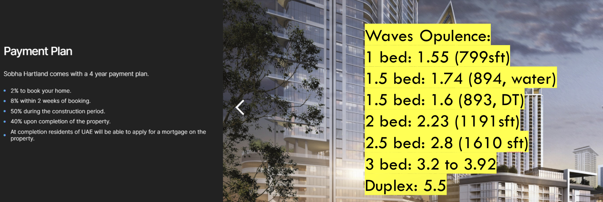 Sobha Hartland is a collection of towers within the Meydan community. Located between Dubai Creek and the world’s largest crystal lagoon – prices start at just AED 1.22M!