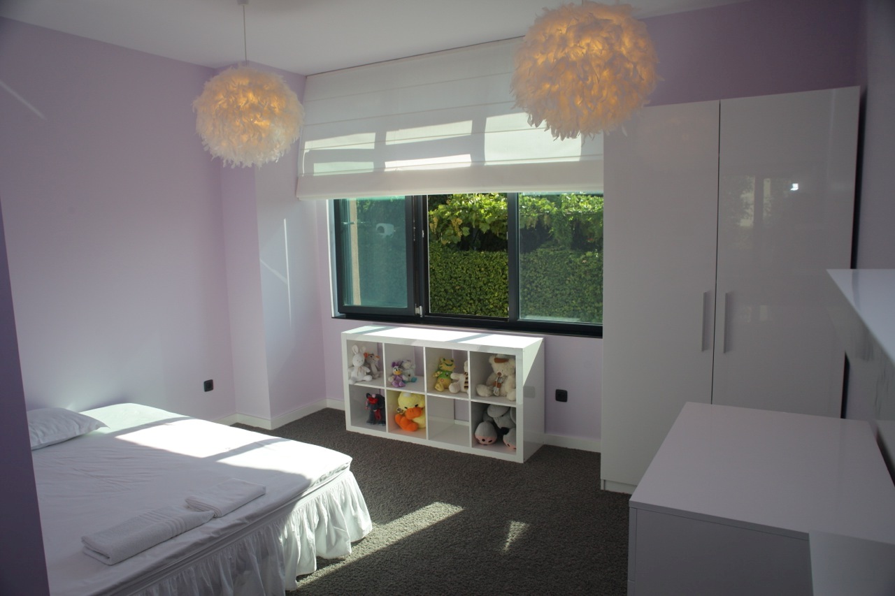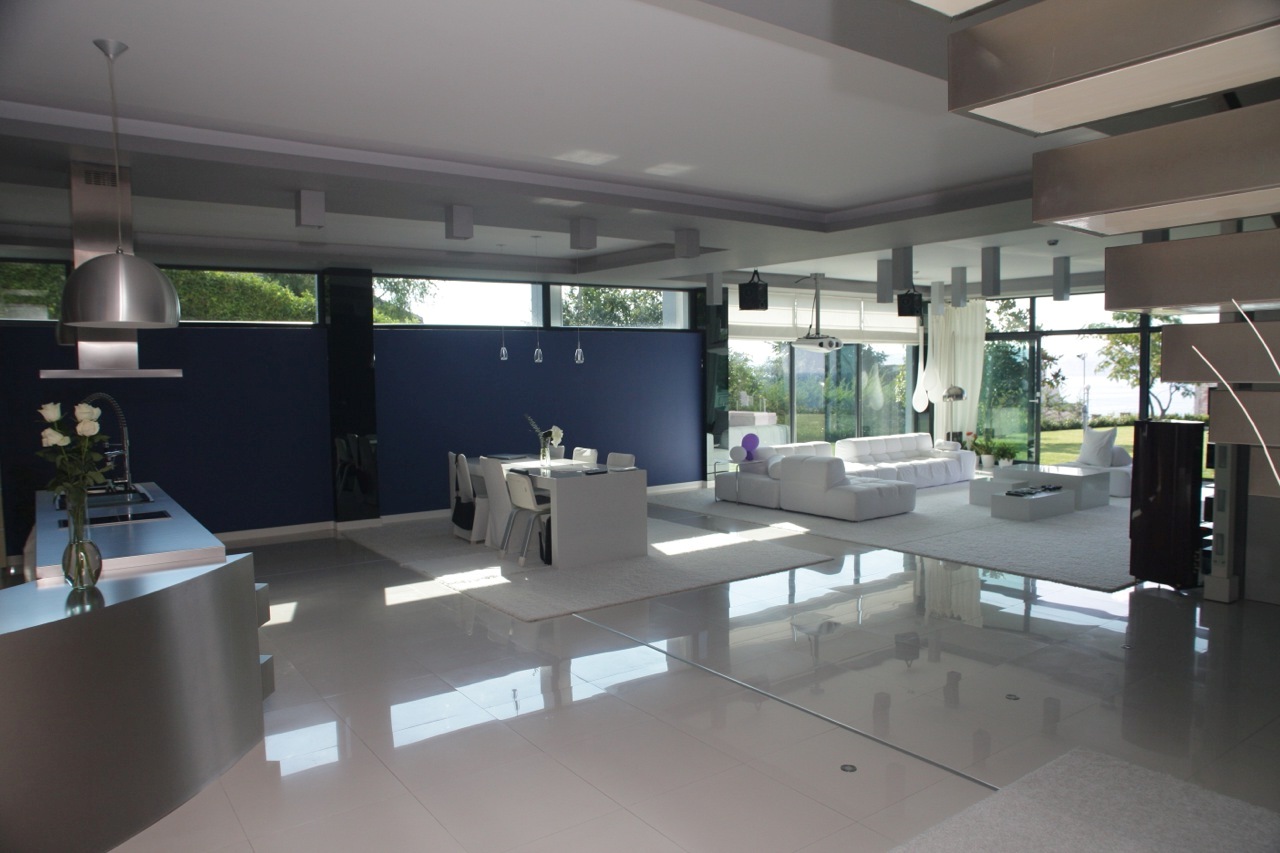 — First floor: it has a size of 150 sqm and consists of spacious living room, divided into a zone with system for home cinema, kitchen and dining area. On this level there is a large room with own bathroom — total size of 60 sqm., used by the personal servicing the house.