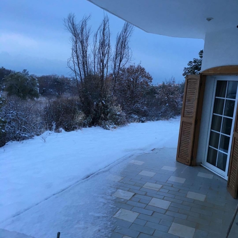 A fresh patio covered with bbq , a large table and white sofasis perfect to enjoy a sunny day outdoors or a summer evening with friends.