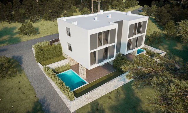Šibenik – Žaborić – SEMI DETACHED HOUSE under construction with a sea view and swimming pool. Situated on the attractive location, near all necessary facilities. Each consists of the basement, ground floor and first floor with their own yard, parking spaces and swimming pool. Proximity to the beach is 100 m.